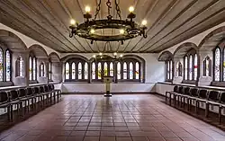 During Operation Tigerfish in 1944, the old town hall burned out completely and the entire interior decor was lost. Modern materials were used in the reconstruction of the building. The Old Town Hall was also extended by three wings in the plain functional style usual for that time. As a result of the new construction, only the nuns' undercroft of the convent of Poor Clares was preserved. This convent was housed in the former Regelhaus (a quasi-monastic building) Zum Lämmlein from 1672 until its abolition in 1782. After that, the buildings were used by the "Hospital of the Holy Spirit".[3]
