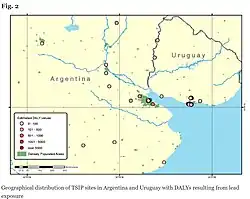 Geographical distribution of TSIP sites in Argentina and Uruguay with DALYs resulting from lead exposure