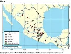 Geographical distribution of TSIP sites in Mexico with DALYs resulting from lead exposure
