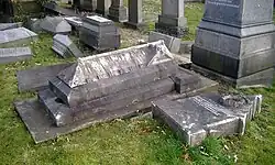 Buried in the cemetery (Grave G493) is John Hulley, founder of the Liverpool Gymnasium and the National Olympian Association, who died in 1873. Revival of interest in his role in Olympic history was initiated by an article (2001) in the Journal of Olympic History entitled "The Mystery of John Hulley".[13] Subsequently, his grave was rediscovered in 2008; it was badly damaged in that the headstone had been removed from the main covering stones and the grave was in a very bad condition from 130 years of atmospheric pollution.[14][15][16]