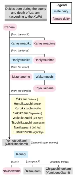 Toyouke-Ōmikami (r: 5th row from the top) is a granddaughter to Izanagi by her father Wakumusubi, who was born while Izanami was still alive (based on Kojiki).
