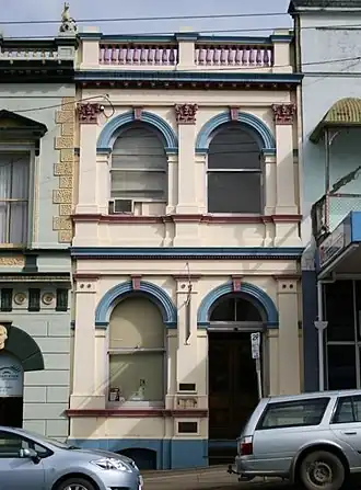 The main entrance is located on the western side of the facade and is accessed from the street via two concrete steps with risers finished with tessellated tiles. A pair of painted timber paneled doors with an arched and glazed fanlight above provides access into a small entry vestibule which is lined with timber paneling to walls and ceilings and hardwood boards to the floor. The vestibule recesses into and provides access to the building's foyer space via another pair of timber paneled swing doors with two glazed and arched panels inset. A tall, arched window with double-hung sashes and a masonry sill is located to the east of the front entrance together with a basement window. Windows on the upper level are similar in design but are slightly shorter in height.[1]