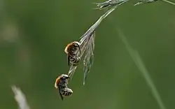 Trachusa byssina nests in self-dug cavities in the earth, singly or in small colonies (clusters of 10-50 nests). The nest is a branching earth tube 10–15 cm long. 2-4 brood cells are placed one behind the other at the end of the side aisles. For the construction of the cells, strips are cut out of the leaves of various trees and herbs, which serve as cell walls. Leaves from birch (Betula), hawthorn (Crataegus), willowherb (Epilobium), beech (Fagus sylvatica), English oak (Quercus robur), roses (Rosa) or blackberries (Rubus fruticosus) are used.[4] Small bits of resin are then collected and deposited at the end of the brood cell until there is a sufficient amount to coat the inside of the leaves with a layer of resin.[5] The inside is mostly covered by pine resin (Pinus sylvestris), possibly also by spruce (Picea abies).[4]