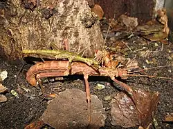 An initially undescribed species was discovered in 2009 by Bresseel also on Luzon in Aurora province near the city of San Luis at the waterfalls of Cunayan and Ditumabo. It was first called Trachyaretaon echinatus[18] and has been found in the terrariums of European enthusiasts since around 2011. The incorrect classification was recognized a little later and so the stock was in circulation for a long time under the name Trachyaretaon sp. 'Aurora'. The Phasmid Study Group lists it under the PSG number 317. In April 2010, Bresseel, Tim Bollens and Rob Krijns collected an adult female in Marinfata on the road to Infanta in Quezon province on Luzon. From their eggs a sexual stock could be established. This in turn was identified as Trachyaretaon echinatus and was referred to as Trachyaretaon echinatus 'Marinfata' for years. It is listed by the Phasmid Study Group under the PSG number 326.[16] Both breeding lines were identified by Hennemann as representatives of the same species, which he described in 2023 as Trachyaretaon bresseeli.[8]