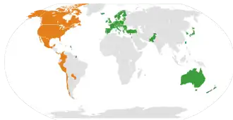 Initially having 16 members, the TISA has expanded to include 23 parties. Since the European Union represents 28 member states, there are 50 countries represented.[12] The number of countries represented in each continent are: 32 in Europe, 7 in Asia, 5 in North America, 3 in South America, 2 in Oceania, and 1 in Africa. The 23 TiSA parties in order of their income categories are:[13]