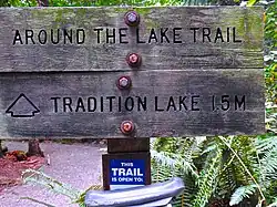 Tradition Lake is located on the northwestern edge of Tiger Mountain, one of the Issaquah Alps. The lake and surrounding wetlands are part of the West Tiger Mountain Natural Resources Conservation Area, managed by the Washington State Department of Natural Resources.[1] The lake drains the slopes of the mountain through several streams. However, it has no outlet streams and instead drains into the aquifer. The city of Issaquah once used the lake for drinking water, and remnants of this infrastructure are still visible along I-90.[2]