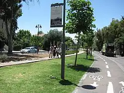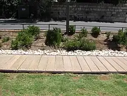 The pedestrian path is a raised boardwalk made from molded concrete planks with an imitation wood finish, laid directly over the original railroad tracks and ties.[4][10] Wood was not used for either the walkway or benches in the project due to the Jerusalem municipality's concern for maintenance and prevention of vandalism,[4] and to avoid damage from the occasional snowfall.[7] To the side of the tracks is a paved bicycle path, which will eventually be linked to the Jerusalem Metropolitan Park that will yield 42 kilometres (26 mi) of continuous cycling trails.[2][7] In between the walking and biking paths in the wider sections is a strip of grass; in narrower sections, ornamental plants border the park.[4] The park was planted with plane trees.[2]