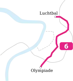 Tram route 6 begins at the Metropolis P+R next to the Metropolis cinema complex in the southern part of the Luchtbal suburb. The route then uses the Groenendaallaan and Delbekelaan, before arriving at the Gabriel Theunis bridge over the Albert canal. After crossing the canal, the route enters the pre-metro network, which it uses between Sport to the north and Plantin to the south. After coming above ground near the Charlottalei, it follows the Belgielei to the Harmonie park, and then the Jan van Rijswijcklaan to its terminus Olympiade in the Kiel neighborhood.[1]