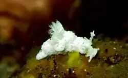 This goniodorid nudibranch is opaque white in colour, with a thin brown ring halfway along the oral tentacles. The gills are unusually large for a Trapania and the body is covered with raised irregular bumps.