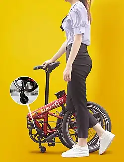 Rolling wheels are installed for some folding bikes for ease of portage when folded. For example, Dahon designed the Landing Gear, a specialized device that attaches to the bottom of the bike frame near the pedals. It features a foldable wheel that provides additional support when the bike is folded. This support makes it easy to maneuver the bike in its compact, folded state, offering exceptional convenience for everyday use.[20]