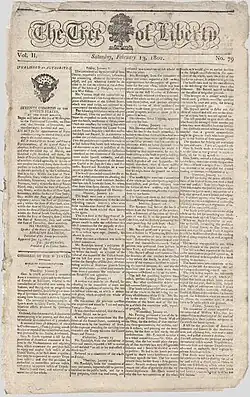 The Tree of Liberty, published weekly from 1800 to about 1810, was the second newspaper in Pittsburgh, Pennsylvania, United States.[2] John D. Israel established the paper and issued it from a building owned by Hugh Henry Brackenridge.[3] Israel's columns promoted the Democratic-Republican politics of Thomas Jefferson while denouncing Federalists and their local organ, the Pittsburgh Gazette.[4]