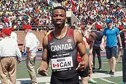 Harris competed in his first international competition at the 2010 World Junior Championships in Athletics in the 400 m sprint. He competed in the 2011 Canadian Junior Track and Field Championships in the 200 m and 400 m events winning gold in both. Though he was still a junior, he competed in the 2011 Canadian Track and Field Championships winning gold in the 400 m with a time of 46.24 seconds, becoming the first Canadian to win gold in the same event in both the junior and senior championships in the same year.[2] Less than a month later, Harris received his first international medal at the 2011 Pan American Junior Athletics Championships in the 4 × 100 m relay winning the silver medal.[4] Harris competed in the 200 m event at the 2012 Summer Olympics, finishing 5th in his heat.[4] At the 2013 World Championships in Moscow, Harris again ran in the 200 m event, finishing 5th in his heat with a time of 20.68 s.[4]
