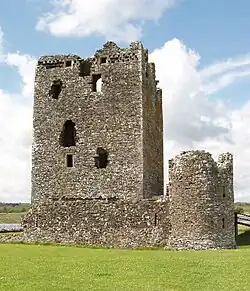 The name Threave is most likely derived from the Cumbric tref, meaning "homestead", suggesting that the island was settled before Gaelic-speaking people arrived in the area in the 7th century. The site has traditionally been associated with Fergus of Galloway, the 12th-century Lord of Galloway, though there is no evidence to support this. The chronicler John of Fordun records that, in 1308, Edward Bruce defeated a force of Gallwegians on the River Dee, and afterward "burnt up the island".[2] Archaeological finds of a penny dated to 1300, unearthed in the context of burned buildings, may locate this event at Threave.[3] Excavations in the 1970s revealed traces of buildings that could be attributed to this period, and which could have formed part of an early stronghold of the Lords of Galloway.[4]