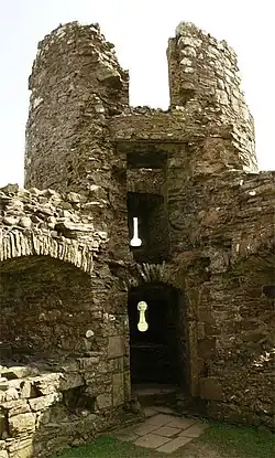 The top level was used as servants' quarters or, during times of trouble, as accommodation for the garrison. The battlements were accessed from this floor, and nine windows gave views in all directions. An outer door at this level allowed equipment to be hauled up from ground level. On three sides, holes in the external walls would have supported a timber gallery known as a bretèche, which allowed the defenders to drop objects on attackers at the walls, while a more permanent machicolation over the entrance served the same purpose.[26]