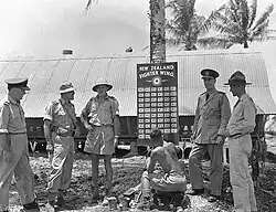 A group of officers beside the New Zealand Fighter Wing scoreboard at Ondonga, New Georgia; Freeman stands to the immediate left of the scoreboard