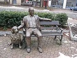 In 2005 a bronze statue of Albany's 73rd mayor Thomas Whalen III (served 1983-93) and his golden retriever named Finn McCool was installed in the park. The statue is seated on a park bench with his right hand on top of the dog's head.[10] Mayor Whalen is the only mayor of Albany to have a statue erected in his honor in the city. A statue for Mayor Corning was proposed and commissioned though it was never cast, a clay model of which sat in Mayor Whalen's office for many years.[11] The statues of Mayor Whalen and his dog are life-size, and including the bench the monument is 16 feet (4.9 m) long and 15 feet (4.6 m) wide, it was designed by Hy Rosen.[12]