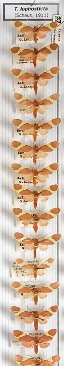 - ^ Toulgoët, Hervé de & Navatte, Jocelyne (2000). "Trichromia lophosticta (Schaus, 1911)". Illustrated Catalogue of the Arctiidae Arctiinae and Pericopinae of French Guyana Found in the Collection of the Museum National d'Histoire Naturelle in Paris. Retrieved September 16, 2019.