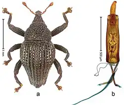The beetle is 2.04–2.51 mm long. It has a black body with ferruginous tarsi and antennae. The body is elongate and subovate, with a distinct constriction between the pronotum and elytra visible both dorsally and in profile. The rostrum features a median ridge and a pair of submedian ridges, with a scabrous texture just behind the epistome. Sparse rows of suberect setae are present along the furrows. The epistome bears a transverse, angular ridge. The pronotum shows a subapical constriction and has a coarsely punctate, scabrous surface. Each puncture contains a suberect, weakly club-shaped scale inserted at the posterior rim.[1]