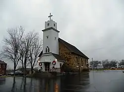 The first German Lutheran immigrants to the area around Friedheim gathered in each other's homes for Sunday worship. Regular church services were eventually held in the home of Bernard Guessenberg who had the largest log house available. As early as 1843, the sacraments were provided once a month by Pastor Theodore Gruber of Paitzdorf when weather permitted.[2][3] In 1847, the Lutheran families in Friedheim got their own parish pastor, Friedrich Julius Blitz, who was a graduate of Altenburg's Concordia Seminary. The first church, a log cabin was built in 1848 on the present church property. In 1849, a log cabin was built to serve as a Lutheran school. In 1856, a new permanent church building was constructed at a cost of $500, which was made from local sandstone rocks. The huge stones were hauled a quarter of a mile by oxen to the church site. The cornerstone for the present church was laid on May 6, 1857. The church was remodeled in 1948 for its 100th anniversary.[4][5] There is an active Sunday school, Ladies Aid, softball and dart ball teams, vacation Bible school, youth group and men's club.[6]