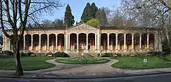 The Trinkhalle (pump house) in the Kurhaus spa complex in Baden-Baden, Germany[1] was built 1839–42 by Heinrich Hübsch in a complementary architectural style as the spa's main building. The 90-metre arcade is lined with frescos and benches. The spa waters are said to have curative powers.[2]