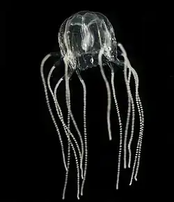 - ^ a b Werner, Bernhard; Cutress, Charles E.; Studebaker, John P. (August 1971). "Life Cycle of Tripedalia cystophora Conant (Cubomedusae)". Nature. 232 (5312): 582–583. Bibcode:1971Natur.232..582W. doi:10.1038/232582a0. ISSN 1476-4687. PMID 16063105. S2CID 4181455.