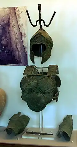The triple-disc cuirass was a type of bronze cuirass used in Southern Italy during the fifth and fourth centuries BC. It is named after the three discs, two on top and one on the bottom, which form a triangular plate of armor for the chest. The chest plate was connected to a back plate with shoulder- and side-plates.[1] Modern scholars frequently call this armor a Samnite cuirass, but it is not clear that it was a symbol of their identity.[2] It offered a greater amount of protection than the single-disc kardiophylax.[3]