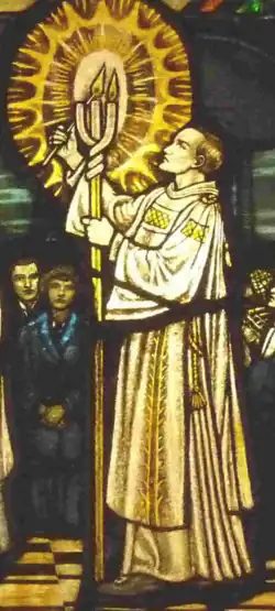 In the Easter Vigil service, the deacon or priest lights each of its three candles in succession, chanting each time in ascending tones, "Lumen Christi" ("The light of Christ"), to which the choir answers "Deo gratias" ("Thanks be to God"). From one of the candles on the triple candlestick, the Paschal candle is afterwards lit during the chanting of the Exsultet.[3][4]