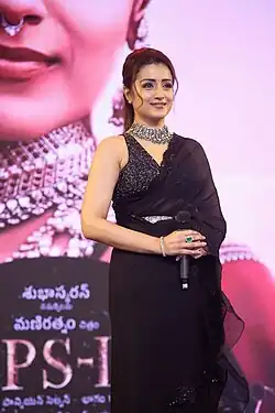 She was next seen in Mani Ratnam's historical drama Ponniyin Selvan: I (2022), in the role of the Chola princess, Kundavai, her performance received critical acclaim and she was nominated for Filmfare Award for Best Actress – Tamil.[98][99][100] Her next appearance was in Tamil action thriller movie Raangi (2022) a journalist who becomes entangled with a terrorist organisation.[101]