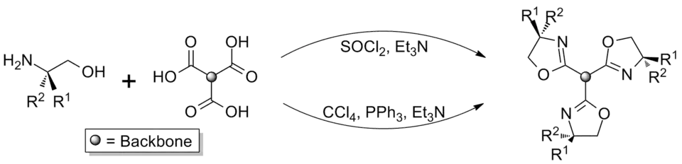 Suitable tripodal compounds, such as trimesic acid[6] and nitrilotriacetic acid,[7] can be converted directly to trisoxazolines. The simplicity of this approach is beneficial, however it only allows a limited variety of structures to be produced, due to the limited range of available starting materials.