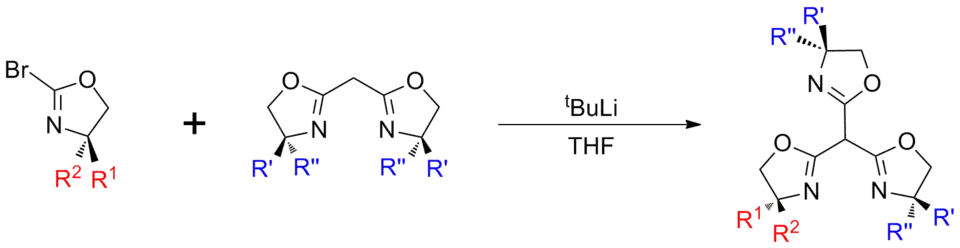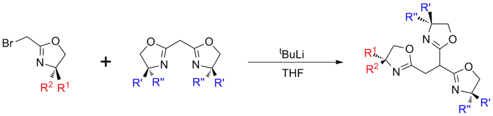 Modular synthesis allows for a more diverse range of structures, however the multi-step reactions can result in lower overall yields. In general synthesis involves the generation of separate mono‑oxazoline (typically halogenated) and bis-oxazoline units, which are then coupled using a strong base such as tBuLi[8] or KN(SiMe3)2.