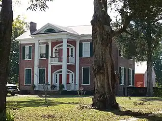 A simple two-story central portico with simple box columns adorns the front elevation and shelters the doors on both levels. The front doorways on the first and second stories both feature sidelights and full fanlights. It is the only brick antebellum house in Wilcox County.[2]