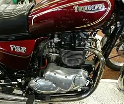 Unlike most Triumph models, no USA style with high handlebars and two-gallon tank was officially specified (until the TSX8-see below), all advertised models coming with the Italian four-gallon tank and low handlebars as well as the newly introduced alloy 'dog leg' clutch and front brake levers.[5] The actual version exported to the USA received a black paint scheme with gold-lined red 'wings' along with newly shaped megaphone mufflers and German Bing carburettors.[6] A one-off variant in line with the Triumph Bonneville T140EX Executive was produced for a London dealer, albeit again in gold-lined black, but with the Executive's standard Brealey-Smith 'Sabre' fairing and luggage by Sigma.[7] All TSS were shod with Avon Roadrunner tyres.