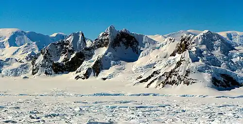 Triune Peaks (69°8′S 66°52′W / 69.133°S 66.867°W) are three prominent, sharply pointed rock peaks, rising 12 nautical miles (22 km) northeast of Mount Balfour and overlooking Wordie Ice Shelf on the west coast of Antarctic Peninsula. First roughly surveyed from the ground by British Graham Land Expedition (BGLE), 1936–37. Photographed from the air by Ronne Antarctic Research Expedition (RARE), December 1947. Resurveyed from the ground by Falkland Islands Dependencies Survey (FIDS), November 1958. The United Kingdom Antarctic Place-Names Committee (UK-APC) name derives from the number of peaks in the group.