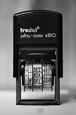 The company's current name is derived from a product designation. During 1947 and 1948, the first plastic date stamp with the Trodat name was produced. Trodat is a portmanteau of "TRO", standing for Trolitul, a plastic previously used for stamp manufacture, and "DAT", for date stamp. After rebranding in the late 1960s, Trodat became the official company name.[1]