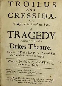 Troilus And Cressida; Or, Truth Found Too Late is a 1679 tragedy by the English writer John Dryden. It was first staged by the Duke's Company at the Dorset Garden Theatre in London. It was a reworking of William Shakespeare's 1602 play Troilus and Cressida, set during the Trojan Wars. In acknowledgement of this Dryden has the prologue spoken by Shakespeare's ghost, defending the alterations made to the play.[1]