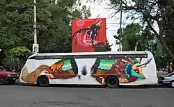 After 2009, the three trolleybuses remained in their respective locations for some time. The borough government still allowed artists, community members and even advertisers to paint the buses periodically, painting over whatever was there previously. In February 2012, the trolleybus in Colonia Hipódromo was painted by Japanese artist Fumiko Nakashima with her work given the title of “Doble Vida” or “Double Life.”[3] The work was to commemorate the one-year anniversary of the Japan earthquake and tsunami, along with a ceremony on March 11, 2012.[13] The work was part of a public art program called Haru ga kita (Spring comes) en México under this artist along with musician Emiliano Isamu. It was sponsored by the Garros Galería in Mexico City, the Fundación Japón México and the Cuauhtémoc borough.[3][14]