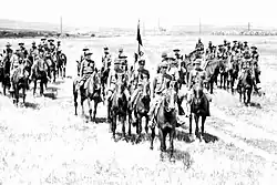 During the Mexican border emergency of 1916, Troop B was among the Washington units called up and "performed the considerable feat of recruiting up to wartime strength and assembling at their mobilization camp in six days".[6] The troop departed for Calexico, California by rail on June 30 and, by July 7, had set-up camp.[6]