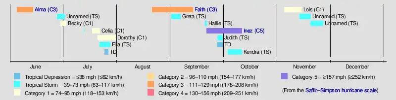 Four tropical cyclones developed in September, including tropical storms Greta, Hallie and Judith, as well as Hurricane Inez. Peaking as a Category 5 hurricane on the Saffir–Simpson hurricane wind scale with winds of 165 mph (270 km/h), Inez was the strongest tropical cyclone of the season. Although Inez persisted into October, no other system developed that month.[6] Two named storms usually form in October.[9] The final formally named storm, Hurricane Lois, existed from November 4 to November 11.[6]