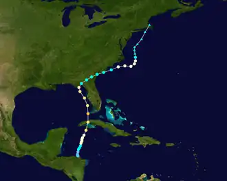 A strong tropical wave developed into a tropical depression in the northwestern Caribbean Sea on June 28.[12] The depression moved slowly northward and although it remained poorly defined throughout its duration,[5] the system intensified into a tropical storm early the following day.[12] Also despite being described as poorly defined, the wind field was well organized, especially in the northeastern quadrant. Around 14:00 UTC on June 29, the storm made landfall on Cuba's south coast just west of the modern-day border of Artemisa and Mayabeque provinces with winds of 40 mph (64 km/h). The cyclone emerged into the Straights of Florida several hours later. Early on June 30, the system peaked with sustained winds of 45 mph (72 km/h) and a minimum pressure of 1,004 mbar (29.6 inHg) while approaching the Florida Keys. Continuing northward, the storm passed just west of the Tampa Bay area on July 1 before striking Cedar Key at 22:00 UTC with winds of 45 mph (72 km/h). The system curved northeastward and weakened to a tropical depression over southern Georgia at 06:00 UTC on July 2, about 12 hours before dissipating.[12]