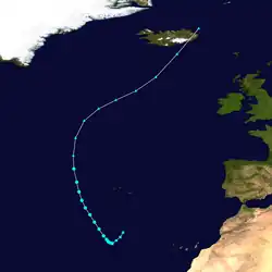 On November 13, an area of low pressure developed in the eastern Atlantic at the tail-end of a cold front connected to the extratropical remnants of Lois. Surface observations and satellite imagery suggest a subtropical storm formed at 18:00 UTC that day. The system moved west and slowly shed its frontal boundaries; it is thus analyzed to have become a tropical storm on November 14. The small system developed organized banding features, and ship observations support it reaching winds of at least 65 mph (105 km/h), although the sparsity of data suggests it could have become a hurricane. The storm began curving poleward and passed west of the Azores on November 17, where it intercepted cold, dry air and transitioned into an extratropical cyclone around 18:00 UTC that day.[12]