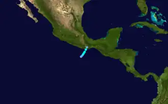 The origins of Beatriz was first traced to a tropical wave which exited the coast of West Africa on May 18. The wave moved westward through the Atlantic and Caribbean with minimal convection, though convection increased when the wave moved into the Eastern Pacific Ocean from Central America through May 25 and 26. A broad area of low pressure developed from the wave about 700 miles (1,100 km) south-southeast of Acapulco, Mexico. Over the next few days, the circulation of the low remained elongated, but favorable conditions allowed the system to develop organized convection.[3] Early on May 31, the low was found better organized, leading the NHC to classify the disturbance as a tropical depression at 12:00 UTC on May 31 around 150 miles (240 km) southwest of Puerto Angel, Mexico.[4] The depression moved slowly northeastward embedded within an area of deep southwesterly flow around a large mid to upper-level trough. In an environment defined by warm waters and light to moderate wind shear the depression was upgraded into Tropical Storm Beatriz while 40 miles (64 km) southwest of Puerto Angel at 18:00 UTC on June 1.[5] Beatriz reached its peak intensity with maximum sustained winds of 45 mph (75 km/h) and a minimum barometric pressure of 1002 mbar (hPa; 29.59 inHg) shortly before making landfall west of Puerto Angel that evening.[6][7] Beatriz weakened to a tropical depression by 06:00 UTC on June 2 and quickly dissipated over the mountainous terrain of Mexico.[8] The remnants of Beatriz still maintained some convection and moved into the Gulf of Mexico where they failed to redevelop due to strong wind shear.[9]