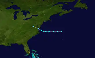 Upon becoming a tropical cyclone early on June 30, Bret attained maximum sustained winds of 70 mph (110 km/h). About six hours later, at 1200 UTC, the storm also attained its minimum barometric pressure of 996 mbar (29.4 inHg).[1] Around 2200 UTC on June 30, a reconnaissance aircraft flight observed hurricane-force winds, though Bret was not upgraded to a hurricane because the minimum barometric pressure was considered too high.[2] About an hour later, the National Hurricane Center noted that Bret was moving westward toward Virginia at 20 mph (25 km/h) and entering a region of colder sea surface temperatures, causing further intensification to become unlikely.[3] Subsequently, the storm curved west-northwestward and rapidly weakened. At 0500 UTC on July 1, Bret made landfall near Oyster, Virginia on the Delmarva Peninsula as a minimal tropical storm. About an hour later, the storm emerged into the Chesapeake Bay and weakened to a tropical depression. Later on July 1, Bret moved inland over mainland Virginia and continued to weaken, until dissipating over the northern portion of the state.[1]
