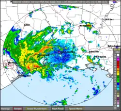 The nascent Tropical Storm had its strongest winds northeast and northwest of the center in the primary area of convection. The thunderstorms were well north of the circulation due to strong wind shear and dry mid-level air.[7] Early on June 21, despite a ragged satellite appearance, observations from the Hurricane Hunters and ships indicated that the storm intensified to reach maximum sustained winds of 60 mph (95 km/h) at 00:00 UTC. Cindy's broad structure and relatively unfavorable conditions prevented further strengthening. Around that time, the cyclone began moving north-northwest.[1] At 09:00 UTC on June 21, the NHC noted that Cindy "does not look like a tropical cyclone" and rather resembled a subtropical cyclone, with a large circulation and most of the convection displaced to the east.[8][9] The pressure bottomed out around 991 millibars (29.3 inHg) early on June 22, despite its atypical appearance on satellite; the only thing maintaining it at tropical characteristics was a burst of convection that occurred near the center which wrapped into the southwestern quadrant of the storm.[10] Around 07:00 UTC that day, Cindy made landfall in extreme southwestern Louisiana just east of Sabine Pass with winds of 50 mph (85 km/h),[1] making Cindy the first named storm to strike the state since Hurricane Isaac in 2012.[11] Rapid weakening ensued once it moved inland, and it weakened to a depression shortly afterwards.[1] At 21:00 UTC, the NHC issued their last advisory on Cindy and announced that further advisories would be issued by the Weather Prediction Center (WPC).[12] Cindy continued to lose its tropical characteristics as it weakened gradually inland, and transitioned into a remnant low over western Kentucky at 18:00 UTC on June 23. The remnant low moved east-northeast across the Appalachia region and dissipated over the Mid-Atlantic states on the following day.[1]