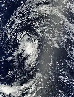 In conjunction with high wind shear, marginal ocean temperatures caused deep convection in association with Flossie to weaken and become ragged; as a result, the forecast called for continued weakening.[5] Instead, a brief reprieve in upper-level winds allowed the system to intensify to a secondary peak of 65 mph (100 km/h) by 12:00 UTC on July 28. An anticyclone northwest of the system increased shear atop the system once again by the following day, and dry air began to become ingested into the circulation.[6] The low-level vortex became exposed to view and progressively ill-defined as outflow boundaries in association with a previous convective burst impeded on the low.[7][8] At 00:00 UTC on July 30, Flossie was downgraded to a tropical depression; after the circulation became indistinguishable on satellite imagery twelve hours later, the system was declared a remnant area of low pressure. At this time, the vortex was centered near the northern coast of Kauai.[1]