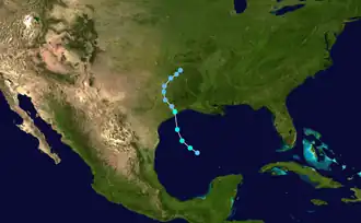 A strong tropical wave accompanied with a low pressure system moved off the coast of Africa on August 19. It moved quickly westward and organized, developing banding features and cirrus outflow near the blossoming convection. The wave nearly developed into a tropical cyclone on August 21, though its fast forward motion dislocated the low level circulation from the deep convection. The wave entered an area of dry air in the central Atlantic Ocean, and by late on August 22 most of the convection dissipated from the system. On August 24, convection increased as the wave passed through the Lesser Antilles, though strong southwesterly upper level wind shear prevented further development. The tropical wave moved through the Caribbean Sea, and developed deep convection due to more favorable conditions over the Gulf of Honduras on August 28. The wave crossed the Yucatán Peninsula, and developed a surface low pressure area on the 29th in the Gulf of Mexico. Convection continued to organize, and the tropical wave developed into Tropical Depression Eleven on August 30 while located 335 miles (539 km) east-southeast of Corpus Christi, Texas.[1]
