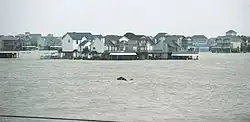 The Southeast Texas communities of Bridge City on Sabine Lake and large areas of nearby Orange (80 miles or 130 kilometres from the center of landfall) were inundated by the storm surge which traveled as much as 16 miles (26 km) inland from the coast. Bridge City mayor Kirk Roccaforte estimated that only about 14 homes (later updated to around two dozen) in the city were unaffected by the surge.[89]