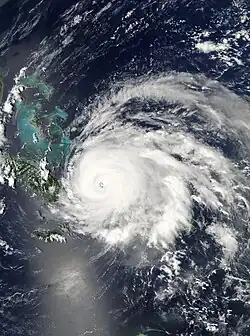 Ike's gradual strengthening began to quicken early on September 3, with the strengthening of an intense rainband around the center of the storm. At roughly 15:00 UTC that day, microwave imaging indicated that a primordial eye was developing within the intensifying tropical storm.[10] Tracking northwestward, the NHC upgraded Ike to hurricane status at 18:00 UTC based on objective satellite intensity estimates and the appearance of the eye on visible satellite imagery.[10][14] During this time, Ike was centered 690 mi (1,110 km) east-northeast of the Leeward Islands and was tracking west-northwestward as a result of a weakened subtropical ridge to its northeast.[10] Ike's placement in an area with virtually no wind shear allowed for the hurricane to undergo explosive intensification despite unfavorable upper-level winds to its north,[14] reaching major hurricane strength six hours after its designation as a hurricane.[15] At 06:00 UTC on September 4, Ike peaked with maximum sustained winds of 145 miles per hour (233 kilometers per hour) and a minimum barometric pressure of 935 millibars (27.6 inches of mercury), making the storm a Category 4 on the Saffir–Simpson hurricane wind scale. After peaking in strength, a ridge of high pressure to the storm's west strengthened, causing Ike to track towards the southwest—a path unusual for the time of year. However, this track also brought the storm into an area of strong wind shear,[10] causing the storm to become asymmetric in structure late on September 4 and weaken,[16] briefly dropping below major hurricane status on September 6 while 150 miles (240 km) east of Grand Turk Island.[17] Although wind shear abated and allowed for reintensification, Ike would fluctuate in strength over the next few days. After passing near the Turks and Caicos Islands, Ike made its first landfall on Inagua in the Bahamas at 13:00 UTC on September 7 with winds of 125 mph (201 km/h).[18]