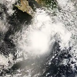 On August 20, a tropical wave became discernible about 800 miles (1300 km) off the coast of Mexico,[2] which in the next day developed a large area of convection, or thunderstorms. Initially, conditions were unfavorable for development, due to strong upper-level wind shear.[3] Tracking northwestward parallel to the Mexican coast, the system became better organized on August 22,[4] though later that day its structure deteriorated.[5] On August 23, a strong area of convection developed and persisted near a circulation center, despite strong wind shear. With banding features becoming more prominent, the National Hurricane Center (NHC) classified the system as Tropical Depression Eleven-E about 345 miles (555 km) south-southeast of the southern tip of the Baja California Peninsula.[6]