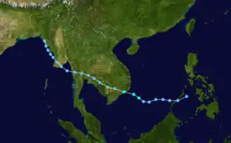 Tropical Storm Kim, known in the Philippines as Tropical Depression Rosing, was the only storm in 1983 to move from the Western Pacific basin into the North Indian Ocean basin.[1] Kim originated as a weak tropical disturbance that formed to the northeast of Truk during the second week of October. It drifted westward over the subsequent days, and on October 15, while located over the South China Sea, the disturbance was classified as a tropical depression. Late the following day, the system was briefly upgraded into a tropical storm, but the storm dissipated quickly after making landfall in Vietnam early on October 17. After trekking across Indochina, the remnants of Kim moved into the Andaman Sea and re-developed into a tropical cyclone on October 19. However, Kim dissipated for good the next day while located inland over Burma.