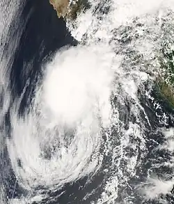 As convective banding formed, the depression gradually intensified and was upgraded a Tropical Storm Lowell six hours later.[6] A deep-layer anticyclone over Mexico steered Lowell northwestward until September 8. However, strong upper-level winds on the south side of the anticyclone produced strong northeasterly to easterly wind shear over the tropical cyclone for several days. Due to the shear, the low level convection became exposed and sheared. despite this, Lowell slowly strengthened and reached a peak intensity of 50 mph (85 km/h), it then passed near Socorro Island without any known damage. The shear had lessened over the system, but with stable and dry air, the storm begin to weaken.[7] Lowell moved towards north and northeast due to a subtropical ridge northwest of the system. It downgraded to a tropical depression at 0600 UTC 10 September as it was moving north-northeastward about 259 mi (417 km) west-southwest of the southern tip of Baja California.[8] Thunderstorm activity near the center had increased slightly on 10 September. The circulation began to slowly spin down as it made landfall around Cabo San Lucas, Mexico at 0900 UTC 11 September.[9] As it made landfall the mid to upper level winds left the low level center exposed form the thunderstorm activity. Lowell degenerated into an elongated surface trough that extended across the southern Gulf of California.[10] It followed a squall line and a frontal boundary and quickly dissipated. The remnant low produced rain across Northwestern Mexico, it later joined Hurricane Ike and caused damage further inland.[1]